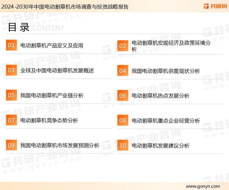 电动割草机凭仗环保、便利的劣势,市场需求不竭添加。共研财产研究院通过对息阐发、业内资深人士和相关企业高管的深度,